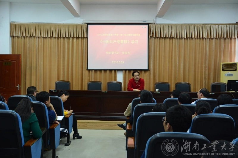 按照学校“两学一做”学习教育实施方案的要求,5月24日下午,土木工程学院围绕“讲政治、有信念”专题在土木楼210报告厅开展第一次集中学习,学习《中国共产党章程》(以下简称“党章”),校纪委书记张亚东出席并作学习辅导。该院党委委员、各党支部书记、全体教工党员及部分学生党员共100余人参加了学习。